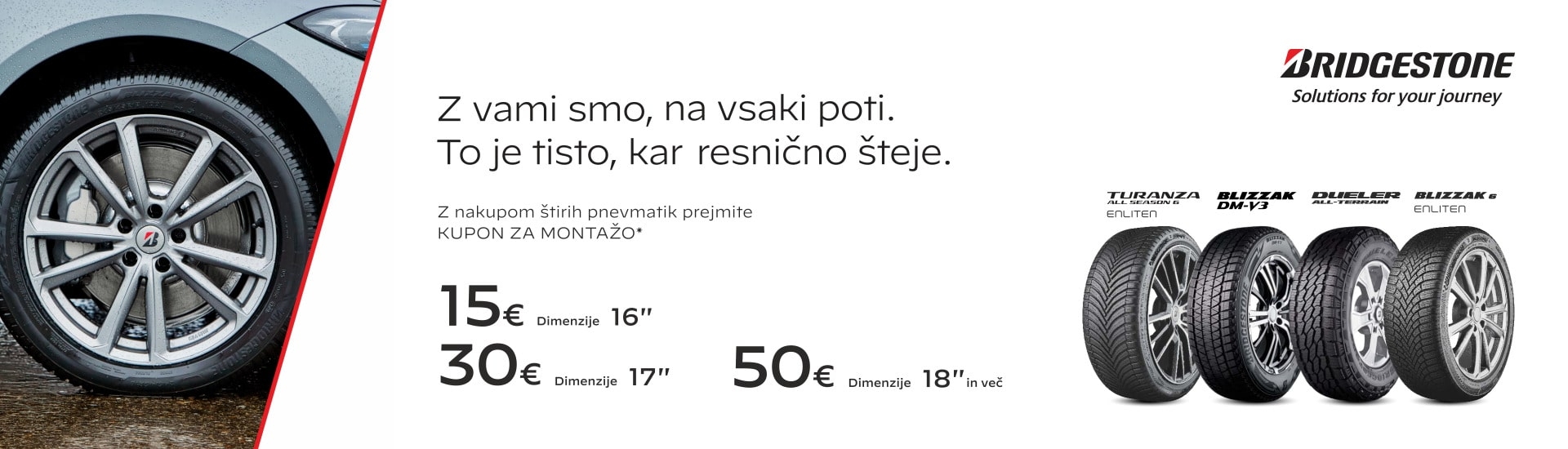 *Promocija traja od 13. oktobra do 13. decembra 2025 oz. do razprodaje zalog. Velja samo ob nakupu 4 zimskih ali celoletnih pnevmatik Bridgestone za osebna, SUV/4x4 in kombi vozila.